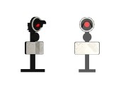 Feu rouge (simple), équipé d'une LED et décoré + pancarte 'UN TRAIN PEUT EN CACHER UN AUTRE'.